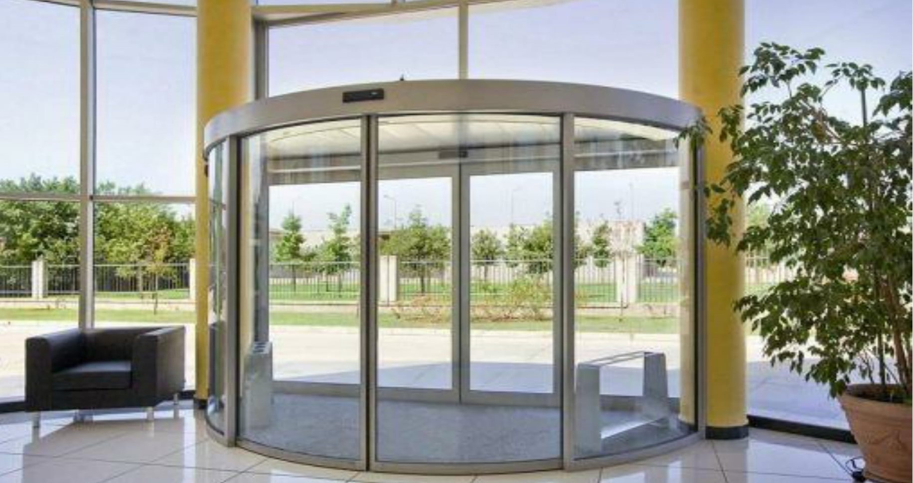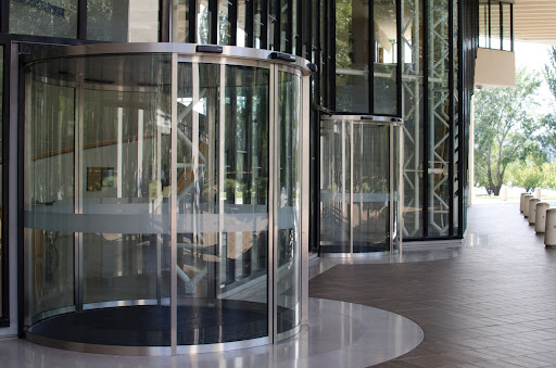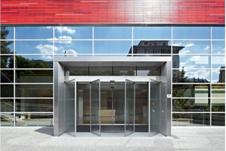 Revolving doors are a component of a facade and also the point of focus of the entrance area of a representative building, custom made in Germany.